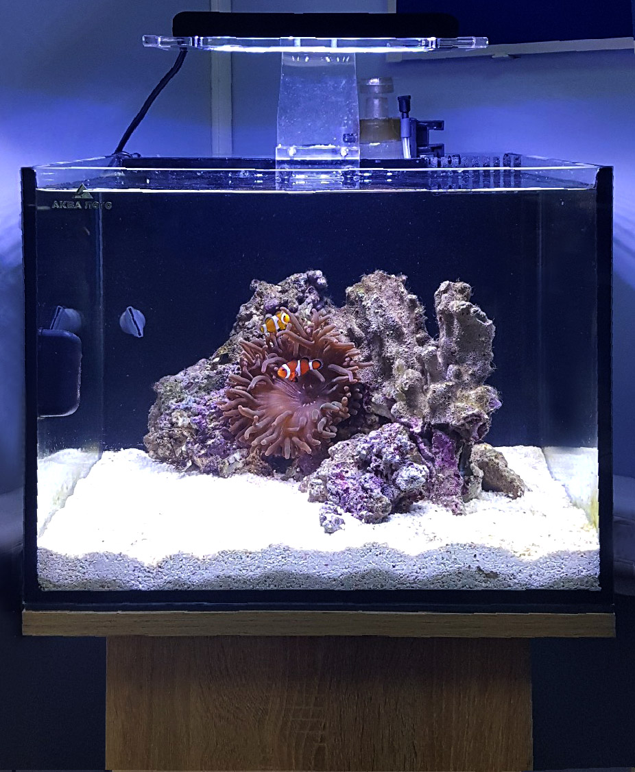аквариум "Ксения" объемом 40 литров, светильник Zet Light с контроллером, флотатор Reef Octopus, помпа течения SICCE MICRA PLUS, подъёмная помпа SICCE, коврик под аквариум SERA, скребок магнитный Tetra, грунт Blue Treasure коралловый арагонитовый белый