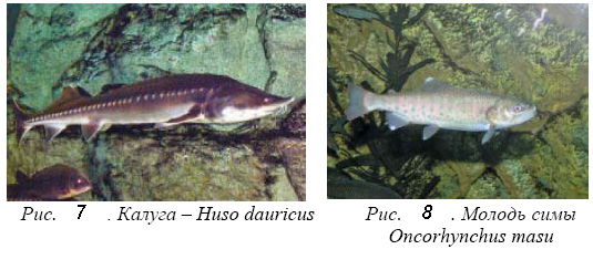 Занимают достойное место в экспозиции Океанариума. В центральном круглом 30-тонном аквариуме помещены двухметровые калуги весом до 30 кг – 4 экз. (рис. 7), амурские осетры и разводимые на Лучегорской ГРЭС, акклиматизированные в Приморском крае сибирский осётр и стерлядь. В экспозиции кроме них около 30 экз. разных карпов, необычные для наших широт американские канальные сомы, краснокнижные черные лещи и окуни ауха.