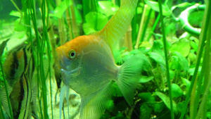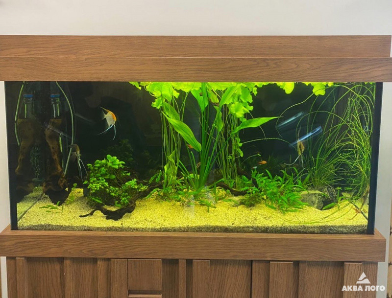 Переоформление вошло в стоимость ежемесячного обслуживания. Живое население аквариума осталось прежним: скалярии, коридорасы, анциструсы, стурисома, миноры и неоны. Объем аквариума 330 литров.