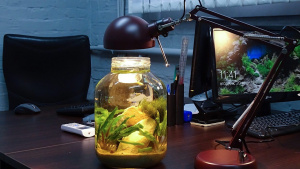 Осталось рассказать об освещении – в обоих случаях подойдёт обычная настольная лампа. Другого оборудования и не нужно. Кормить рыбок нужно ежедневно – крошечной щепотки им хватит. Уход за аквариумом также необременителен – в первом варианте нужно будет иногда прореживать растения, во втором - и этого делать не нужно. Один раз в неделю понадобится подменить пару стаканов воды и почистить стенки губкой – вот, пожалуй, и всё. Дело пяти минут! На оформление ушло не так много времени – 15 минут для опытного аквариумиста и готово! (это при условии, что вода взята из действующего аквариума хотя бы наполовину).