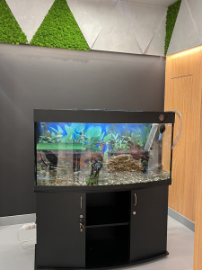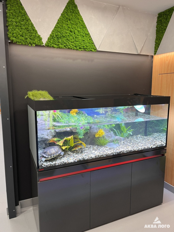 Перед нами стояла задача создания акватеррариума для красноухой черепахи. Для питомца выбрали просторный аквариум с тумбой, объемом 530 литров, размер аквариума 160х60х65 см. Стадонтовую декорацию изготовили по индивидуальному проекту на нашем производстве.