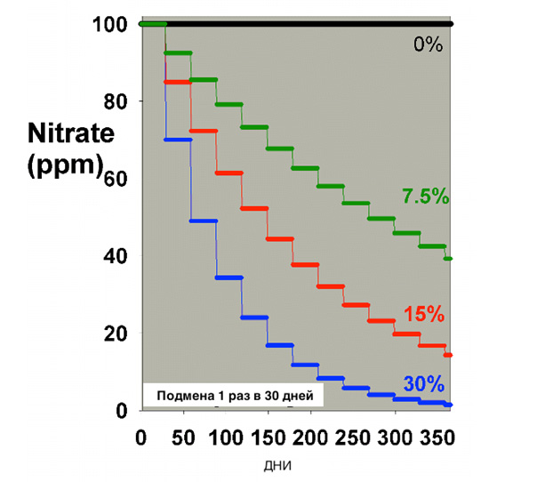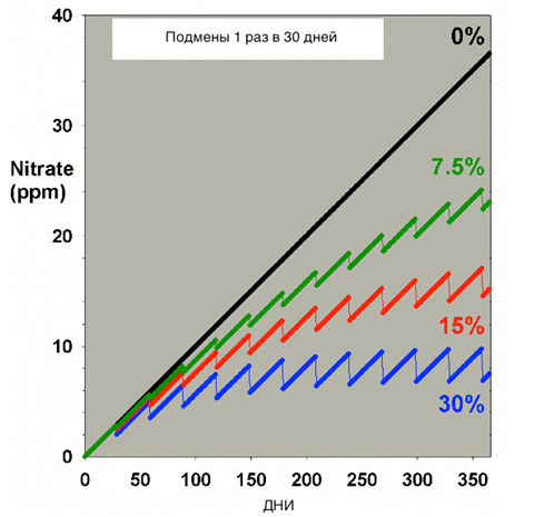 Иными словами, подмены ежедневно 0%, 0,25%, 0,5% и 1% объема в день. Это ровные линии, практически не уступающие по эффективности разовым месячным подменам, однако не «дергающие» параметры воды. Не стоит забывать, что при подменах все параметры воды, а не только нитрат будут вести себя таким образом.